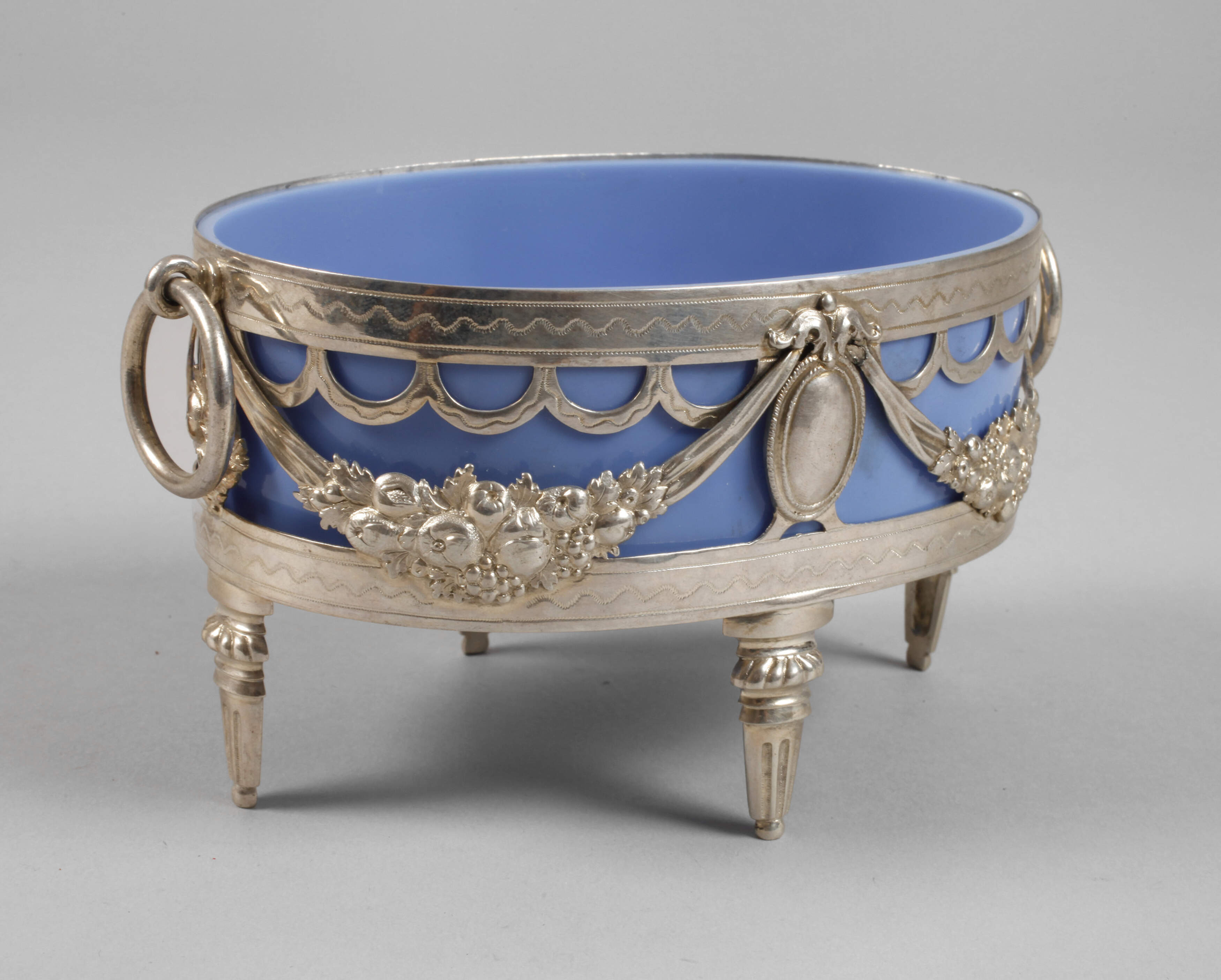 um 1793/95, Silber gestempelt Augsburger Zirbelnuss, Meistermarke PFB für Philipp Friedrich Bruglocher, Meister ab 1771, gestorben 1826, zarte klassizistische Schale auf schlanken Füßen, durchbrochen gestaltet und verziert mit Festons, bewegliche Ösenhenkel, herausnehmbarer Einsatz aus hellblauem Milchglas mit geschliffenem Bodenstern, dieser mit durchgehendem Haarriss von ca. 4 cm, sonst guter altersgemäßer Zustand, L 16 cm, G ohne Einsatz ca. 166 g, Quelle: Helmut Seling, Die Kunst der Augsburger Goldschmiede, Band III, Nr. 2531.