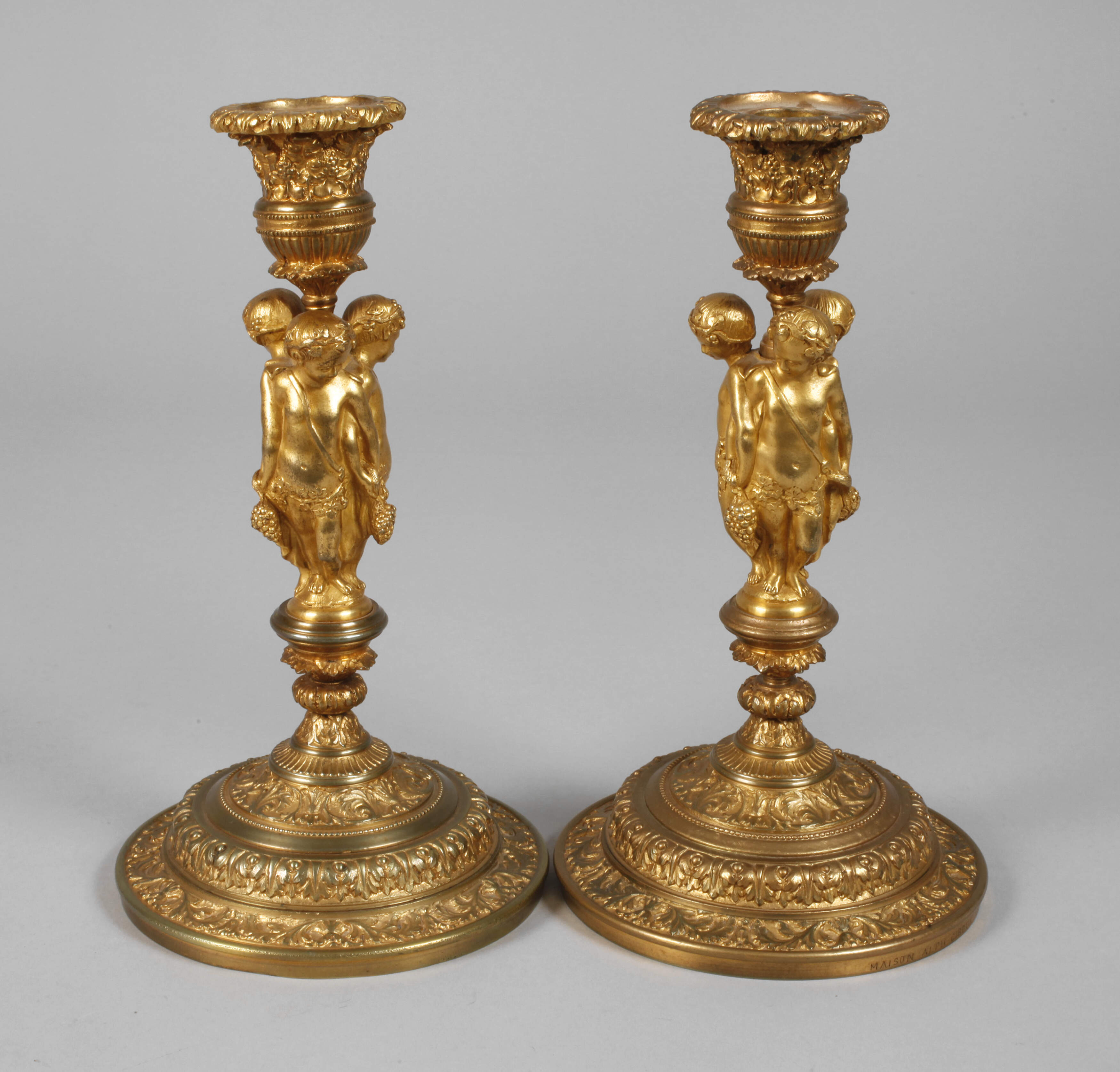 um 1900, gemarkt Maison Alph. Ciroux Paris, Bronze vergoldet, reich mit stilisiertem Akanthuslaub verzierte Leuchter mit gebuckeltem Fuß, Schaft mit je drei Putten als Bacchanten, feststehende Tüllen, Alters- und Gebrauchsspuren, etwas berieben, H je 24,5 cm.