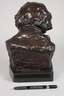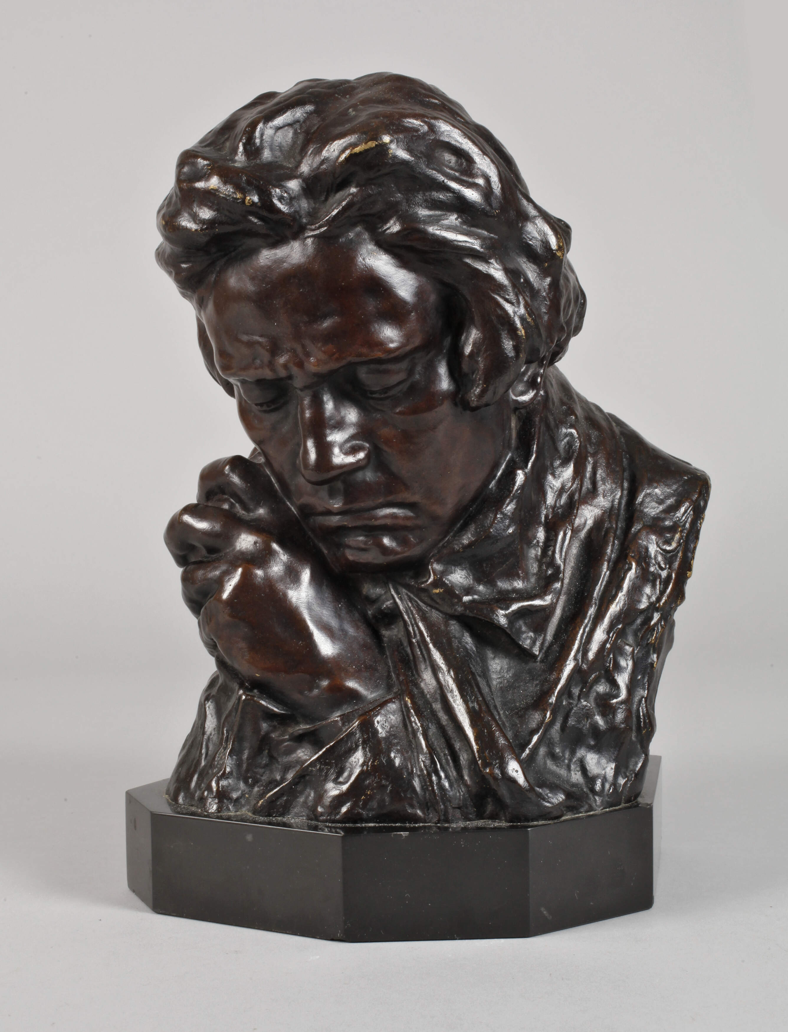 Entwurf 1902, seitlich signiert Fix. Masseau, Gießereistempel M. Collin & Cie. Paris, Bronze dunkelbraun patiniert, Brustdarstellung Beethovens, die verschlungenen Hände zum Gesicht geführt, ein identisches Stück befindet sich im Beethovenhaus Bonn, partiell etwas berieben, H Bronze 24,5 cm, H gesamt 28,5 cm. Künstlerinfo: französischer Bildhauer, Maler und Medailleur des Jugendstils und des Symbolismus (1869 Lyon bis 1937 Paris), Quelle: Wikipedia.