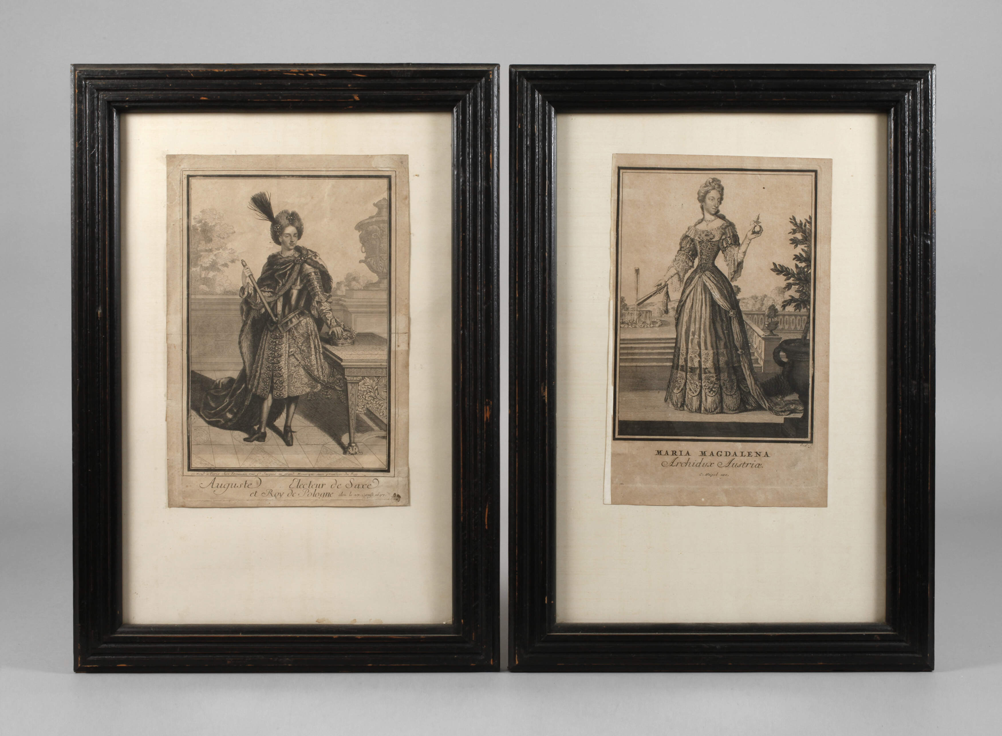 "Auguste Electeur de Saxe et Roy de Pologne", erschienen 1697 und Caspar Luyken, "Maria Magdalena Archidux Austria", jeweils unter der Darstellung im Druck bezeichnet, unterschiedliche Erhaltung, als Pendant gerahmt, Darstellungsmaße max. ca. 28,5 x 19,5 cm.