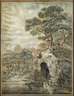 von Wald umgebener See in Ideallandschaft mit gemauertem Grotteneingang und Figurenstaffage in der Mode der Zeit, Tusche und Aquarell auf Papier, auf Unterlagekarton montiert und hierauf signiert und datiert "Ernilie Weissenborn gemalt 1829", fleckig und wellig, hinter Glas in Biedermeierrahmen, Darstellungsmaße ca. 56 x 43 cm.