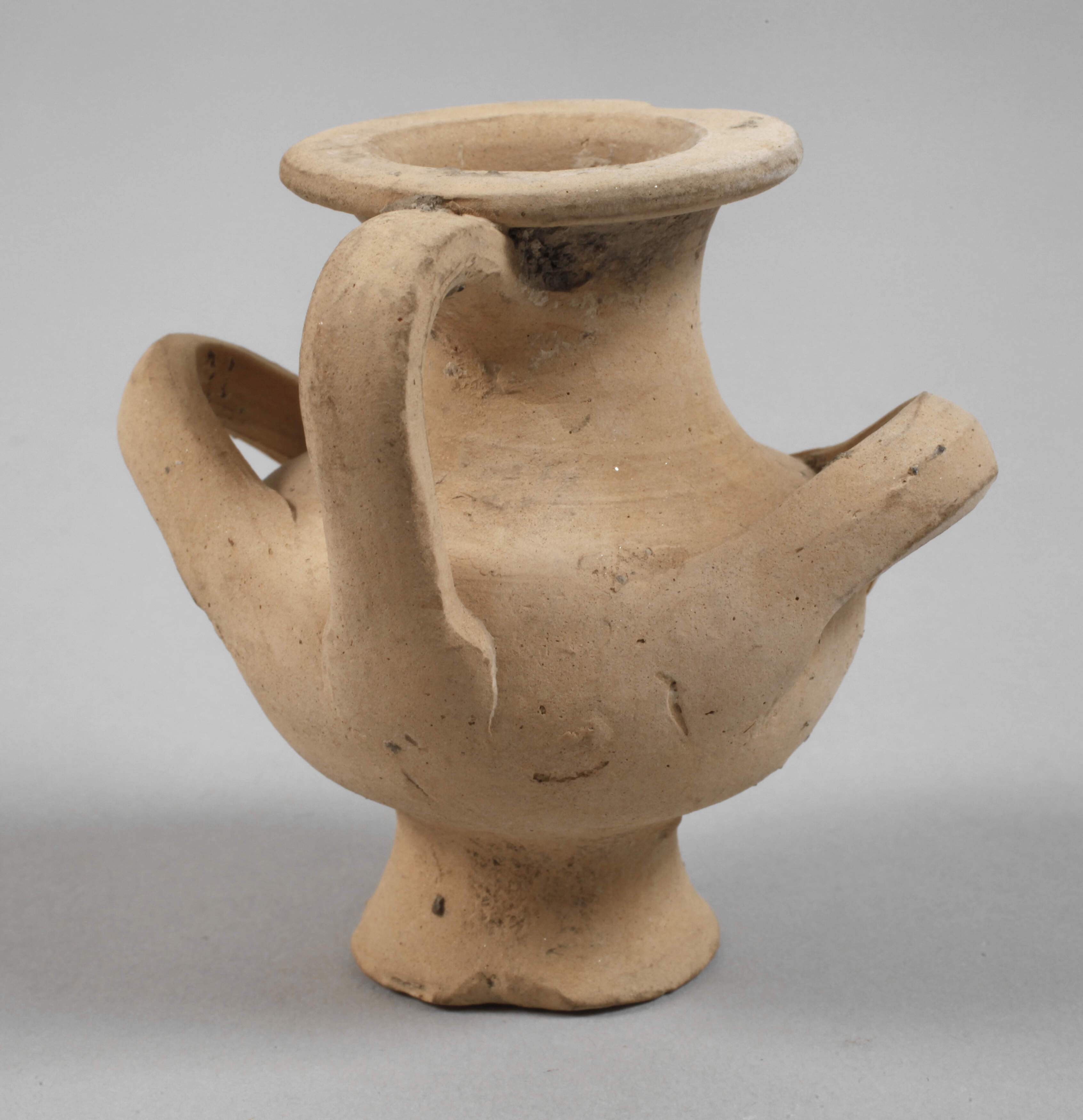 unbestimmten Alters, wohl Griechenland, miniaturhafte Amphore mit gebauchtem Korpus und drei Henkeln, Ausbruch an der Mündung, beigegeben handschriftliche, ungeprüfte Notiz, H 6,5 cm.