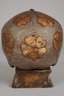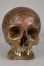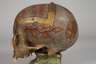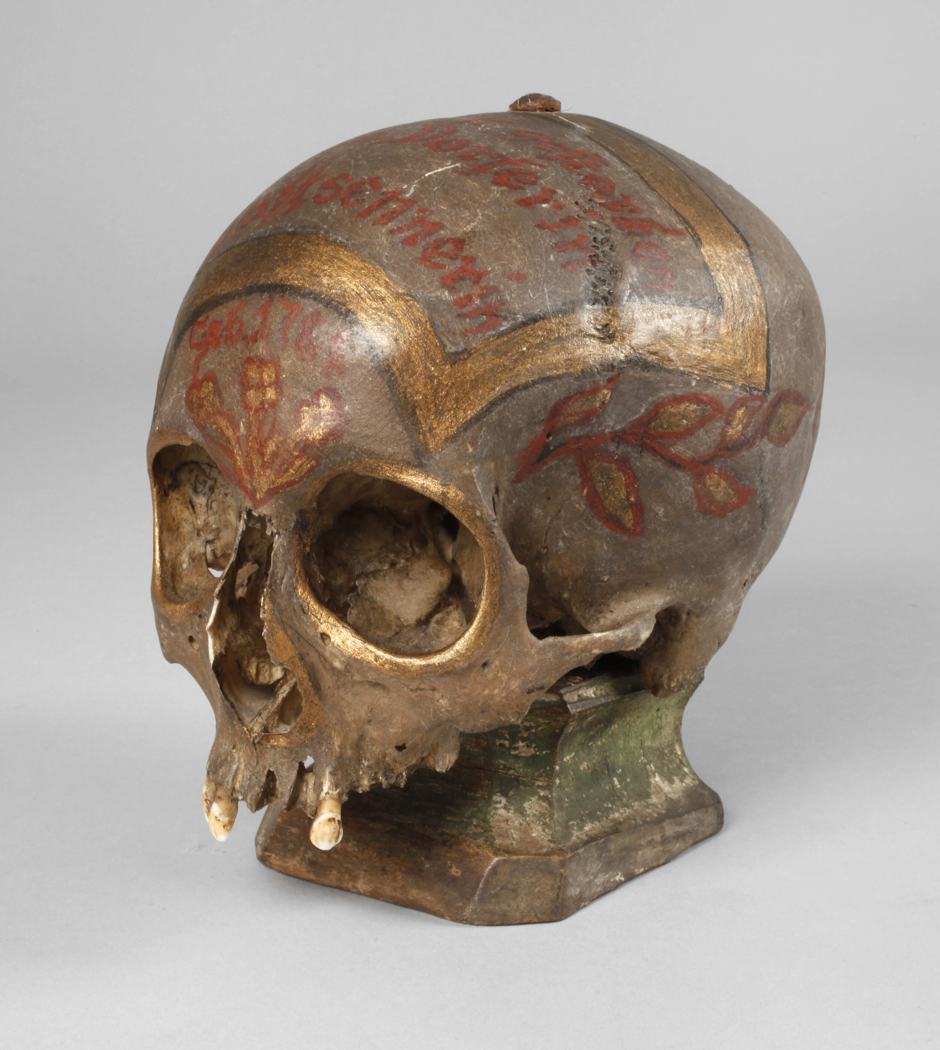 bezeichnet und datiert "1813 ist gestorben Clara Dorferin Gastsennerin geb. 1781", menschlicher Schädel, farbig gefasst und goldbronziert, auf geschnitztem Sockel montiert, starke Erhaltungsmängel, H 18 cm.
