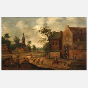 poesievolle dörfliche Szene, der Betrachter des Gemäldes wird Zeuge eines geschäftigen Tuns im Dorf, links im Vordergrund rasten einige Bauern und eine ältere Bäuerin versorgt einen Säugling, rechts daneben machen zwei Buben ihre Späße mit einem alten Mann am Krückstock, im Hintergrund plauschen Bauern vorm Haus und ein weiterer scheint seine Blase an der Hauswand zu erleichtern, altmeisterliche, vielfigürliche, lasierende Genremalerei, Öl auf parkettierter Holzplatte, wohl 17. Jh., unsigniert, rückseitig diverse Annotationen, Malerei etwas verputzt, Malgrund partiell gerissen, alte Restaurierungen, etwas reinigungs- und restaurierungsbedürftig, gerahmt (bestoßen), Falzmaße ca. 40 x 62,5 cm.