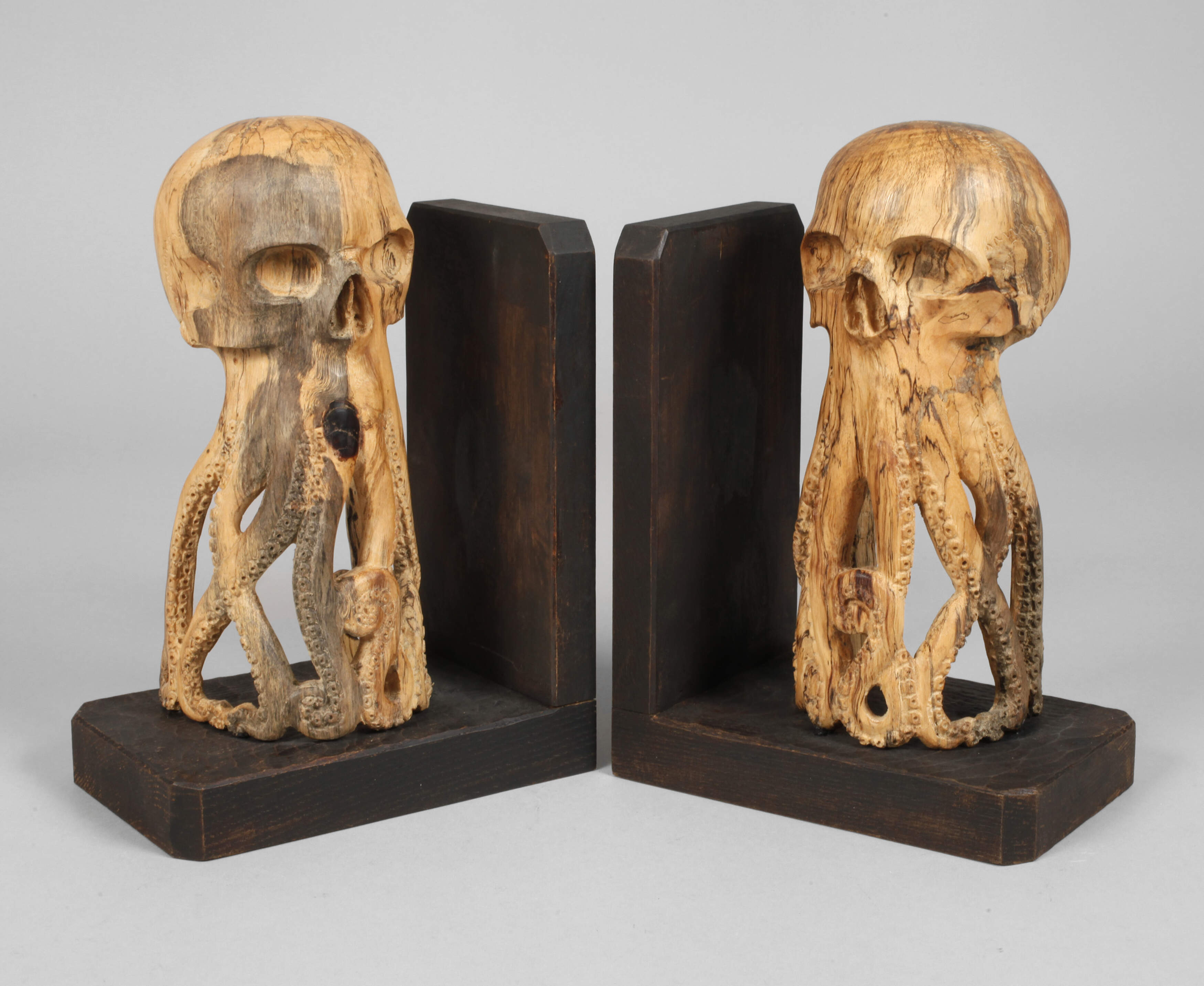 neuzeitlich, aus Wurzelholz gefertigte Kraken mit Totenschädeln, auf dunkel gefassten Laubholzbrettern montiert, H je ca. 24 cm.