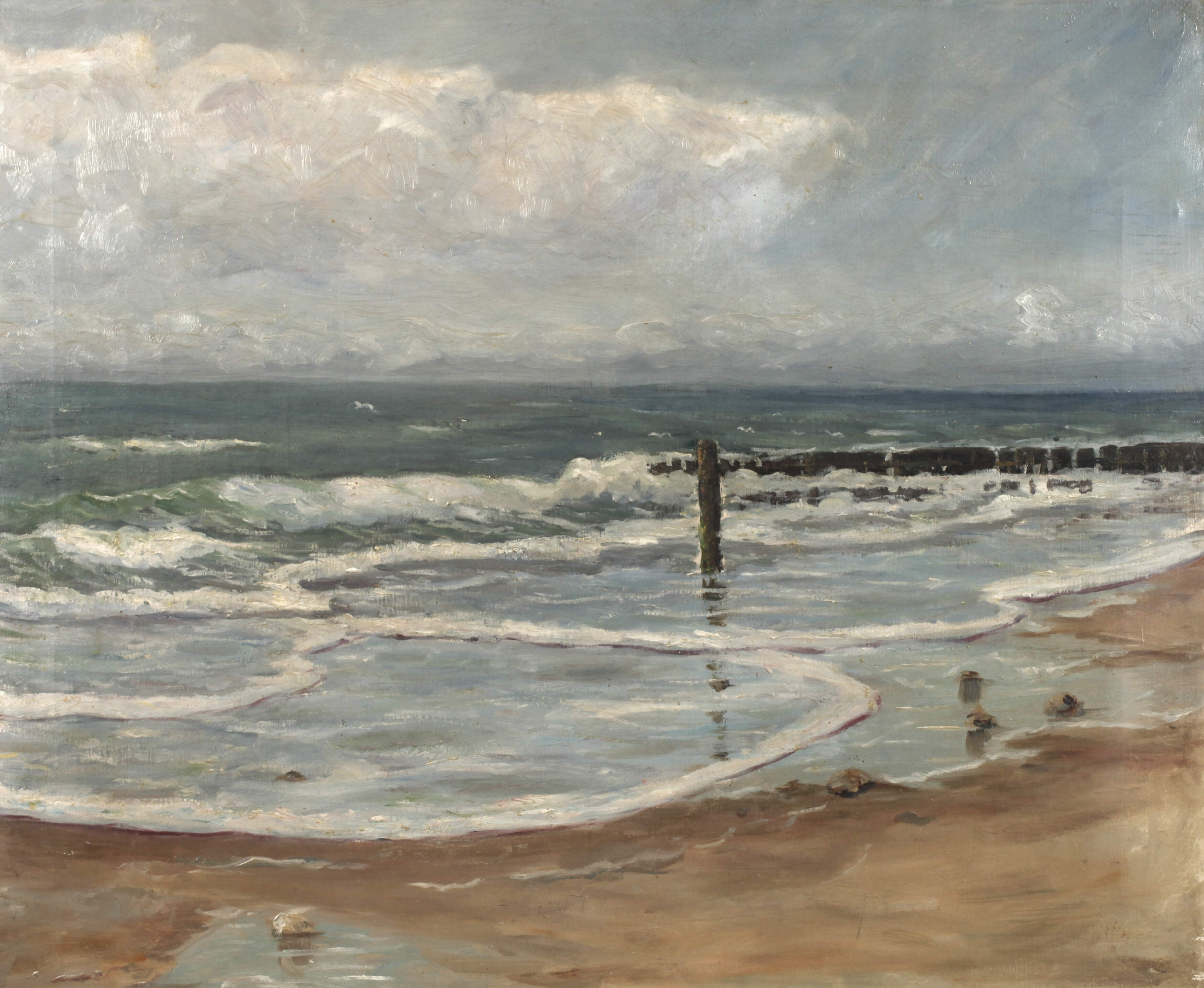 stille Küstenlandschaft mit Blick vom Sandstrand, vorbei an Buhnen und sanften Wellen, aufs weite Meer unter wolkenverhangenem Himmel, gering pastose Malerei, Öl auf Leinwand, rückseitig auf der Leinwand betitelt, signiert und datiert "4. »Ruhige See« Albrecht von Buttlar pinx. [18]96", geringe Craquelure, reinigungs- und etwas restaurierungsbedürftig, im originalen Goldstuckrahmen (rest.bed.) gerahmt, Falzmaße ca. 59 x 71,5 cm.