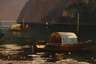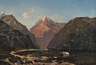 Hirten mit ihrer Herde am Auslauf eines Fjords, vor imposanter, teils schneebedeckter Bergkulisse, lasierende Landschaftsmalerei, Öl auf Leinwand, 2. Hälfte 19. Jh., unsigniert, Craquelure, hinterlegte Fehlstellen in der Leinwand, restauriert, im schönen originalen Goldstuckrahmen gerahmt, Falzmaße ca. 47 x 68,5 cm.
