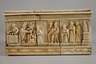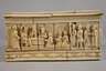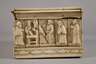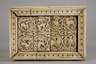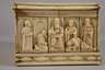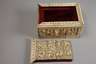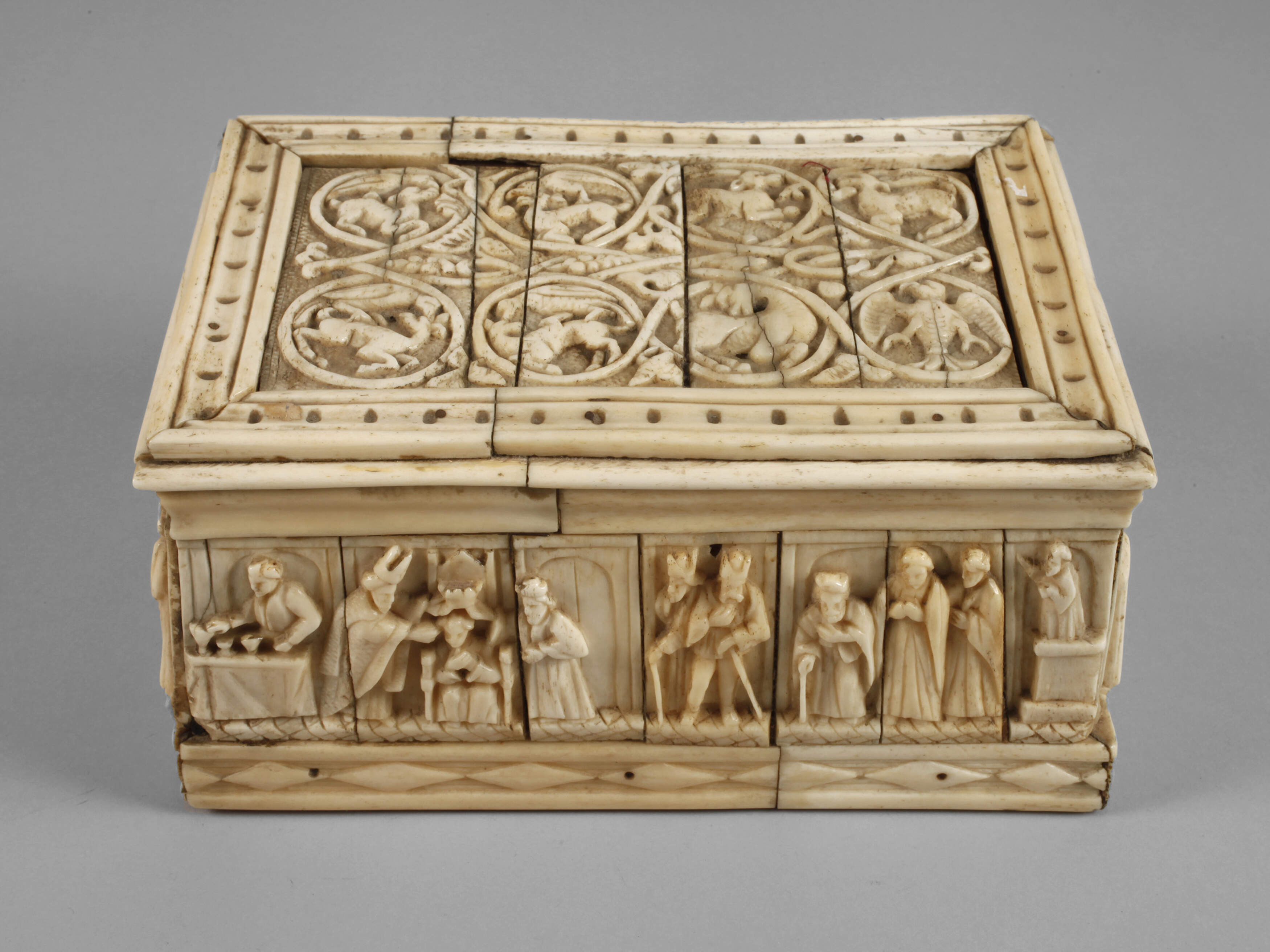 wohl 19. Jh., Knochen aufwendig beschnitzt, mehrteilig gefertigt und montiert, rechteckiger Korpus, umlaufend verziert von figürlichen Reliefs mit Krönungsszene sowie weiteren historisierenden Darstellungen, der schiebbare Deckel zeigt zudem acht stilisierte Tiermotive zwischen Rankwerk, das Innenleben in rotem Samt ausgekleidet, trocknungsrissig, Altersspuren, Maße 11 x 21 x 16 cm.