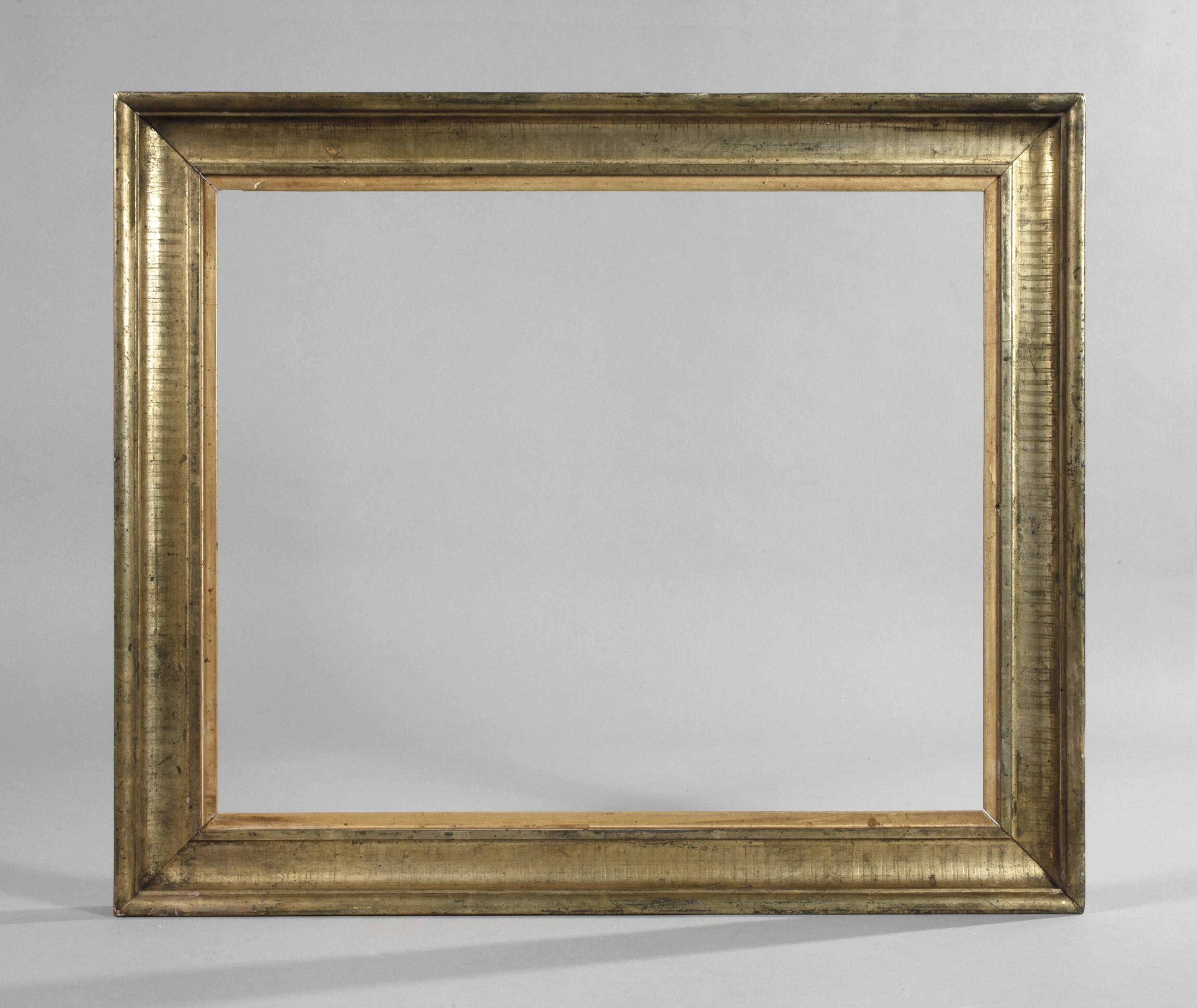 19. Jh., ca. 7 cm breite, aufsteigend profilierte versilberte und schellackpatinierte Holzleiste, Kehle mit angedeutetem Pfeifenschnitt, Ecken auf Gehrung geschnitten, die Ecken etwas bestoßen sonst normale Alters- und Gebrauchsspuren, Falzmaße ca. 55 x 46 cm.