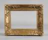 ca. 8 cm breiter, aufsteigend profilierter Goldstuckrahmen, über Eck gearbeitet, mit Muscheln, Rocaillen und Blütenranken auf Gitterwerk, Ecken auf Gehrung geschnitten mit eingesetzten Gratleisten, Farbfassung komplett übergangen mit oberflächlichen Fehlstellen, Alters- und Gebrauchsspuren, Falzmaße ca. 32 x 23,5 cm.