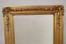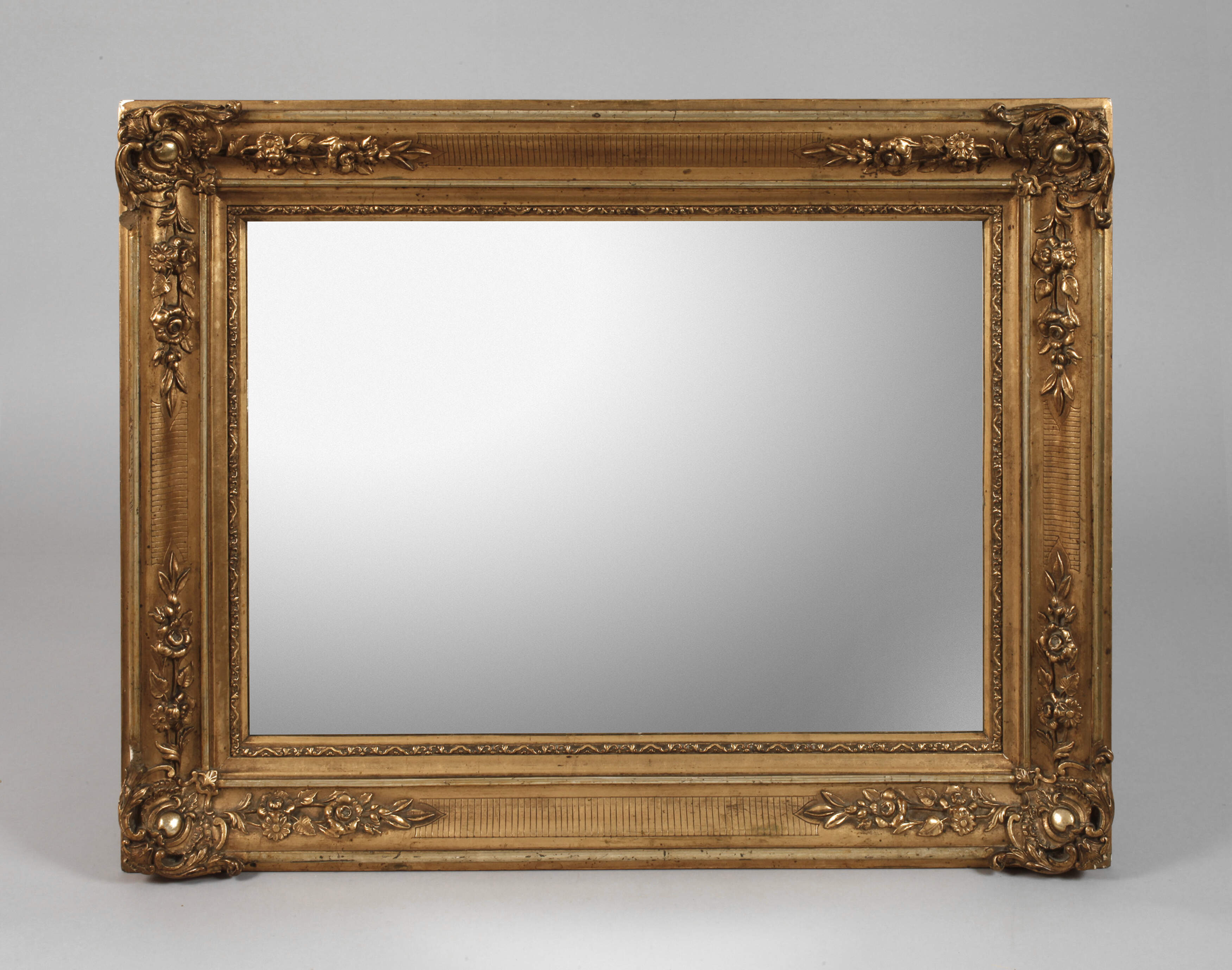 um 1870, ca. 9 cm breiter, aufsteigend profilierter, gestuckter und vergoldeter Rahmen, über Eck gearbeitet, mit ausstehenden Eckkartuschen, halbplastischen Blütenranken und angedeutetem Pfeifenschnitt, auf rückseitig verblattetem Blendrahmen, später eingesetztes Spiegelglas, geringe Fehlstellen, normale Alters- und Gebrauchsspuren, Falzmaße ca. 37 x 53 cm.