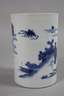 China, 20. Jh., hoher Porzellan-Pinselbecher mit kobaltblauem Unterglasurdekor aus der Begegnung zweier Beamter an kieferbewachsenen Gestaden in einer Vollmondnacht, Ranken- und Wellenbordüre in sogenanntem verborgenen Dekor (chin. ANHUA), Provenience: Sammlung Günther Stelly, Berlin, H 22 cm, D 15 cm.