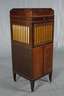um 1920, ungemarkt, im neoklassizistischen Stil gefertigtes Kleinmöbel mit zweitüriger Front und innenliegender Regaleinteilung, im oberen Drittel textilverkleidete Schallflächen, eingelassenes Grammophon mit verchromten Metallteilen originale Kurbel, funktionstüchtig, Oberfläche mit leichten Alters- und Gebrauchsspuren, beigegeben ca. Platten, Maße 135 x 54 x 55 cm.