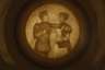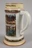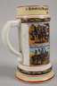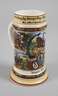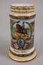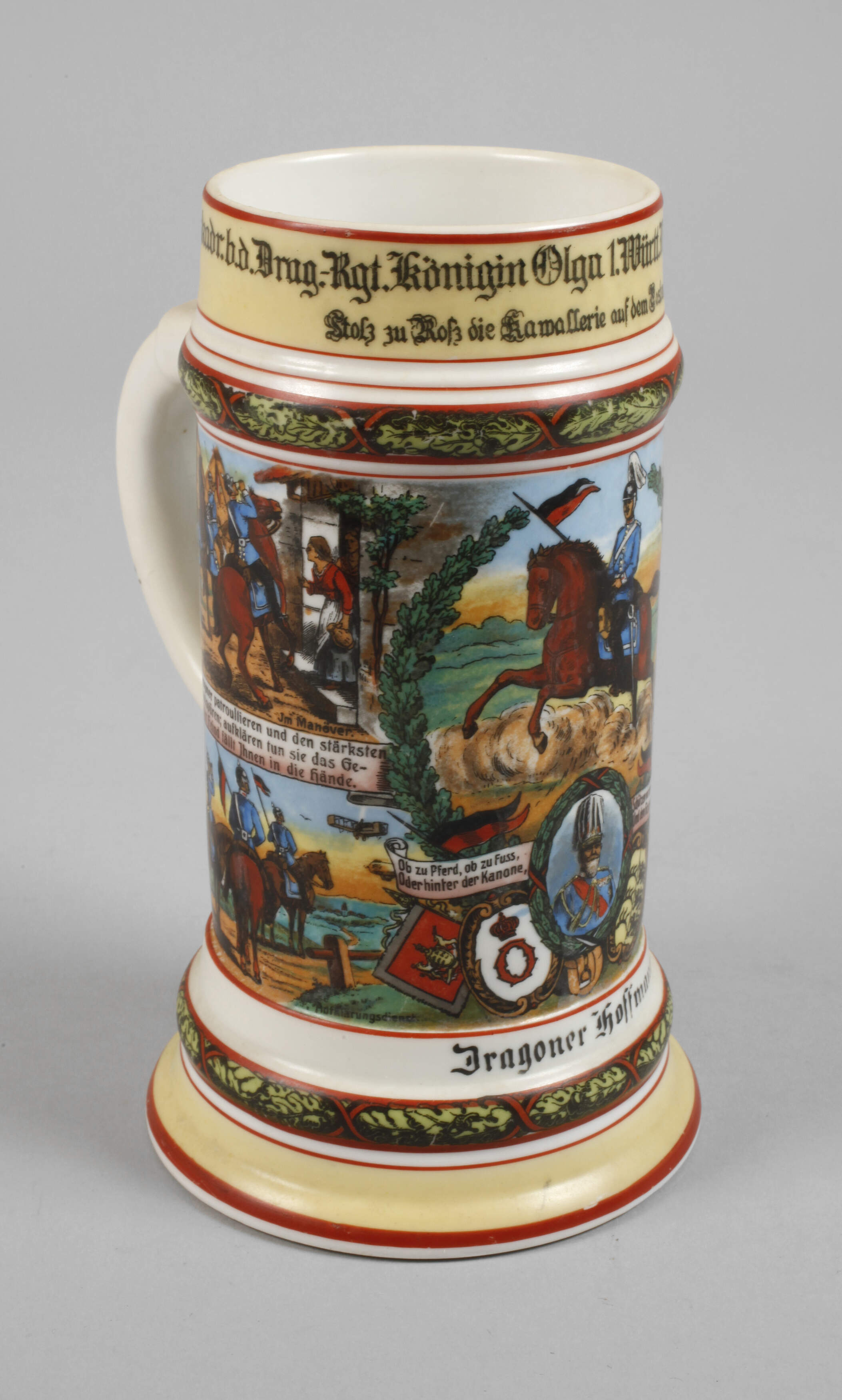 bezeichnet "4 Eskadr. b.d. Drag.-Rgt. Königin Olga 1. Württ. Nr. 25 Ludwigsburg 1909–12.", Namensangabe Dragoner Hoffmann, schauseitig Dragoner mit Lanze zu Pferd im Eichenlaubkranz, unten Wilhelm II. von Württemberg zwischen Wappen- und Regimentstafeln, links und rechts Manöverszenen, hinten zwei Namensleisten, Bodenlithophanie Abschiedsszene, ohne Deckel, Namensleisten stärker verblasst, ansonsten guter Zustand, H 19 cm.