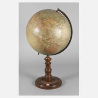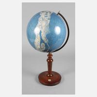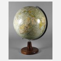 1930er Jahre, bezeichnet Erzett Polit. Erdglobus Verlag Rudolf Zschörnig, Berlin, gedrechselter Fuß aus dunkel gebeiztem Nussbaum, papierbespannte Erdkugel, Oberfläche mit leichten Altersspuren, kleinste Fehlstellen, H ca. 52 cm.