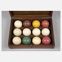 um 1930, elf Stück aus Feinsteinzeug, teils farbig gefasst sowie eine aus Elfenbein, im orig. leinenbespannten Etui, Alters- und Gebrauchsspuren, eine mit Fehlstellen, D Kugel je 5 cm, Maße Etui 7 x 20 x 27 cm.