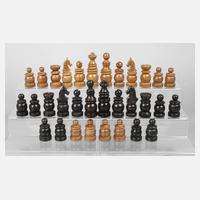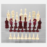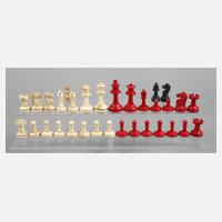 Mitte 20. Jh., Bein gedrechselt, mehrteilig montiert und partiell bordeauxfarben eingefärbt, komplett, kleinere Fehlstellen, ohne Spielbrett, H König 8,5 cm.