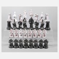 wohl Ende 19. Jh., Bein gedrechselt, teils gefärbt, 29 orig. Figuren sowie drei ergänzte aus Holz, ohne Spielbrett, Fehlstellen, H 7 cm.