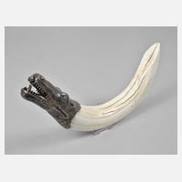 Silbermontur, 2. Hälfte 19. Jh., gestempelt J. Wagner & Sohn sowie Halbmond, Krone, 800, in Form eines Krokodilschädels, scharnierter Unterkiefer mit innenliegender Schnittmechanik, Oberfläche naturgetreu nachempfunden und teilweise geschwärzt, eingesetzte Augen aus Chrysopras, polierter Walrosszahn eines fossilen Tiers (Alter ca. 5–10 Mio. Jahre), Altersspuren, eine Monturbefestigung fehlt, Zahn mit Trocknungsrissen, L Zahn über die Außenlinie 39 cm, L ges. 50 cm.