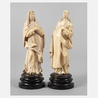 wohl 17. Jh., vermutlich Teile einer Kreuzigungsgruppe, Elfenbein fein beschnitzt, halbplastisch gearbeitete Standfiguren der Heiligen Maria mit vor der Brust gekreuzten Armen sowie dem heiligen Johannes mit ebenfalls ergriffenem Gestus, auf gedrechselten Holzsockeln montiert, stärkere Altersspuren, nicht komplett, H je 20 cm.