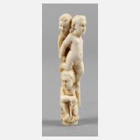 19. Jh., Elfenbein fein geschnitzt, vermutlich gekürztes Griffstück mit Darstellung dreier verschlungener nackter Knaben, L 8 cm.