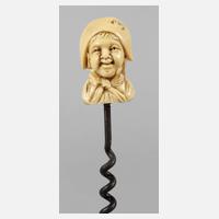 19. Jh., Elfenbein fein beschnitzt, Kopfstück eines jungen Mannes mit quergetragenem Zweispitz und langem Haar, schmiedeeiserne Montierung, Altersspuren, L ges. 11 cm.