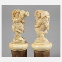 um 1920, fein geschnitzt, vollplastische Darstellung eines Zwerges mit mit Weintrauben gefüllter Kiepe sowie seines durstigen Kollegen, leichte Altersspuren, H je 8 cm.