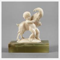 Erbach, um 1920, Elfenbein fein geschnitzt, Darstellung eines kleinen Knaben beim Bändigen eines Ziegenbocks, auf schmalem Sockel aus grünem Onyx, H 8 cm.