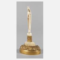 um 1800, Elfenbein fein beschnitzt, grazile Madonna als Standfigur auf Weltkugel mit gesenktem, bekröntem Haupt, fein punzierte Messingmontierung sowie profiliertes Zierelement aus massivem Perlmutt, Krone mit Fehlstelle, H 14 cm.