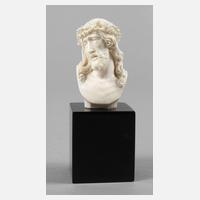 Frankreich, Anfang 20. Jh., seitlich signiert Migeon, Elfenbein feinst beschnitzt, Haupt des leidenden Christus mit Dornenkrone, auf schwarzen Steinsockel montiert, Krone mit kleiner Fehlstelle, sonst gute Erhaltung, H 11 cm.