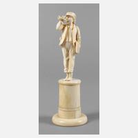 Erbach, um 1900, ungemarkt, Elfenbein fein geschnitzt, mehrteilig montiert, kecker Postbursche mit Tasche und Fanfare, diese sowie im Knöchelbereich alt repariert, auf hohem, zylindrischem Sockel, H 18 cm.