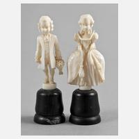 um 1920, ungemarkt, Elfenbein fein beschnitzt, Rokokopärchen mit kleinem Galant im Gehrock und kleinem Fräulein im Reifrock, auf gedrechselten Holzsockeln montiert, eine Figur restauriert, H je 8,5 cm.