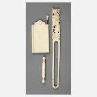 19./20. Jh., Elfenbein gedrechselt bzw. fein geschnitzt, kleiner Notizblock mit sechs beweglichen Blättern und orig. Bleistift, Nadelbehälter mit Schraubgewinde, weiterem Utensil mit figürlicher Darstellung, diese mit Bruchstelle, L max. 21 cm.