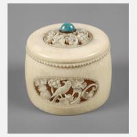 Entwurf Albin Schreiber (deutscher Kunsthandwerker, 1876 Bautzen bis 1959 Unterhaching) um 1910, Elfenbein feinst beschnitzt und teils durchbrochen gearbeitet, Korpus mit Vogelmotiv, der Deckel mit Rankenornament und aufgesetztem Chrysoprascabochon, min. Altersspuren, H 4,5 cm.