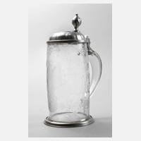 Ende 18. Jh., klares Glas mit Abriss, leicht gewölbter Glaskrug mit breitem Bandhenkel, die Zinnmontierung bestehend aus Standring und godroniertem Deckel mit Kugelknauf, eingelegte figürliche Medaille mit Justitia, umlaufend fein geschliffen, schauseitig Heiligendarstellung, Maria zertritt die Schlange, mit Lilienzweig, seitlich bekröntes Besitzermonogramm AMR mit Festons und Blütenranken, auf der anderen Seite ein großes Blütengebilde, gute originale Erhaltung, ohne Beschädigung, H 24,5 cm.