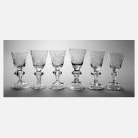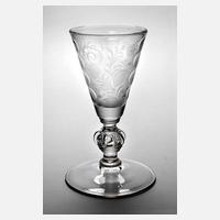Thüringen, um 1730, klares Glas, der getreppte Standfuß mit umlaufendem Fadenabschluss, Schaft mit eingestochener Luftblase, darüber ein breiter Baluster, in den Kuppaansatz übergehend, diese auch mit eingestochener Luftblase, die konische Kuppa angesetzt mit feinem Mattschliffdekor mit dem Besitzermonogramm CH G V.S., Glas von der Herstellung etwas blasig, sonst sehr gute unbeschädigte Erhaltung, die Höhe variiert etwas von 13,3 bis 15,3 cm.