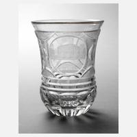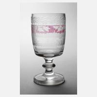 rückseitig mit Widmung, datiert November 1847, klares Glas, partiell roséfarben gebeizt, Mattschliffdekor, schauseitig ”Hamburg vom Wall”, Lorbeerranken am Stand und am Lippenrand, am Stand mehrere kleine oberflächliche Fehlstellen, Gebrauchsspuren, H 16 cm.