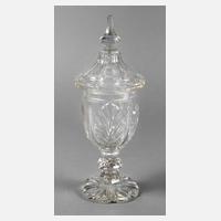1. Hälfte 19. Jh., klares Glas, Walzenschlifffuß, Balusterschaft, die Kuppa mit Linsen und Kerbschliff, facettierter Deckel mit hohem Aufbau, gute unbeschädigte Erhaltung, H 35 cm.