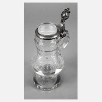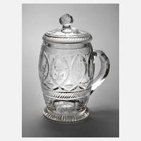 um 1860, klares Glas, geschliffener Bodenstern, massiver gefußter Krug mit geschliffenen Facetten und Oliven, Zinndeckel gepunzt ”Bach”, im Deckel Glaspastenbild, Portrait Karl König von Württemberg, leichte Gebrauchsspuren, H 28 cm.