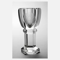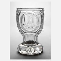 19. Jh., klares Glas, geschliffener Bodenstern, bezeichnete allegorische Darstellungen der drei göttlichen Tugenden, runder Schaft, auf der Kuppa drei Oliven mit feinem figürlichen Mattschliff, dazwischen gesteinelt, am Lippenrand minimal bestoßen, H 13 cm.