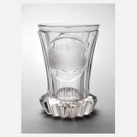 Ranftbecher, Mitte 19. Jh., klares Glas, plangeschliffener massiver Stand, rot gebeizt und fein geschliffen, konische Form mit sechs runden Kartuschen, Ansichten von Steinbad, Neubad, Stadtbad, Schlangenbad und Stephansbad, dazwischen Ornamentik, am Lippenrand eine winzigste Kerbe, sonst gute Erhaltung, H 12,5 cm.