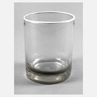 1. Hälfte 19. Jh., klares Glas, blasiger Abriss, zylinderförmiges Gefäß mit abgesetztem Mündungsrand aus augelegtem weißen Glasfaden, Gebrauchsspuren, H 14,5 cm.