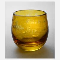 19. Jh., klares Glas, gelb gebeizt, der Boden plangeschliffen mit mattgeschliffener Szene im Bett, Spruch: Trink mich aus und leg mich nieder, steh ich auf, so füll mich wieder, gute Erhaltung, H 6 cm.
