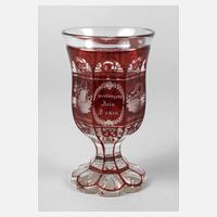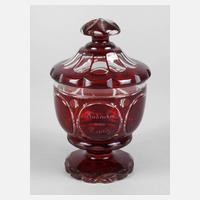 1. Hälfte 19. Jh., klares Glas, rot gebeizt, facettiert mit feinem Mattschliff, eine florale Kartusche mit Inschrift: verlängere dein Leben, desweiteren symbolistischen Darstellungen Gesundheit, Glück, Freude, Freiheit, Hoffnung, Frohsinn und Vergnügen, ein minimalster Oberflächenchip, sonst gute originale Erhaltung, H 16,5 cm.