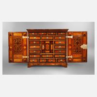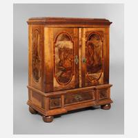 um 1700, Nussbaum und Nussbaummaser auf Eiche furniert, Tür mit feinem Ornamentdekor in Zwetschge, Ahorn und Ebenholz, Inneneinrichtung mit 22 Schüben, alle von Flammleisten gerahmt und mit Tuschmalerei verziert, mittig verschließbare Tür mit weiteren drei Schubladen, alt restauriert, Platte ergänzt, mit Schlüssel, H 76 x B 83 x T 42 cm.
