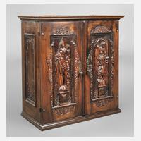 unter Verwendung alter Teile gefertigtes Aufsatzmöbel, in Nussbaum auf Nadelholz furniert, zweitüriger Korpus, Füllung mit feinen allegorischen, figürlichen Darstellungen, innen fein ziselierte Eisenbänder und Schlossplatte, mit Schlüssel, H 84 x B 93 x T 39 cm.