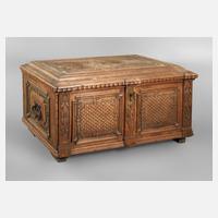 Ende 17. Jh., Eiche massiv, fassadenartig gestaltete Front, mit geschnitzten Kassettenfüllungen und intarsiertem Doppeladler, originales Zangenschloss, mit Schlüssel, alt restauriert, Füße und Sockelleiste ergänzt, H 71 x B 190 x T 63 cm.