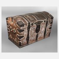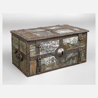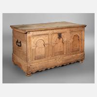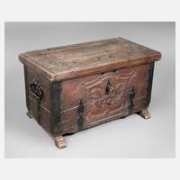 17. Jh., reich mit vernieteten Eichenbändern verzierter Korpus, Deckel mit aufwendigem Schließmechanismus, mit insgesamt acht Zuhaltungen, Kapellenschloss mit ergänztem Schlüssel, funktionstüchtig, Wandung mit Resten alter Malerei, Maße 37 x 79 x 42 cm.