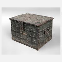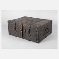 wohl 17. Jh., Korpus aus massiver Eiche, aufwendig mit aufgenieteten Eisenbändern verziert, innen zwei Fächer sowie Geheimfach, welches durch Ziehen der rechten Seitenwand freigegeben wird, altes Zangenschloss mit zwei Zuhaltungen, Gegenstück im Deckel fehlt, mit Schlüssel, stärkere Alters- und Gebrauchsspuren, Maße 38 x 53 x 42 cm.