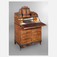 Mitte 18. Jh., Nussbaum auf Nadelholz furniert, dreischübiges Unterteil mit gebauchter Front und originalem, geschnitztem Sockel, darüber Schreibaufsatz mit Schrägklappe, Korpus allseitig mit feiner floraler, brandschattierter Intarsie verziert, die Schreibplatte mit Jagdmotiv in Elfenbein, Nussbaumwurzel und Ahorn, Aufsatz vermutlich später ergänzt, stark restaurierungsbedürftig, H 139 x B 103 x T 50 cm.